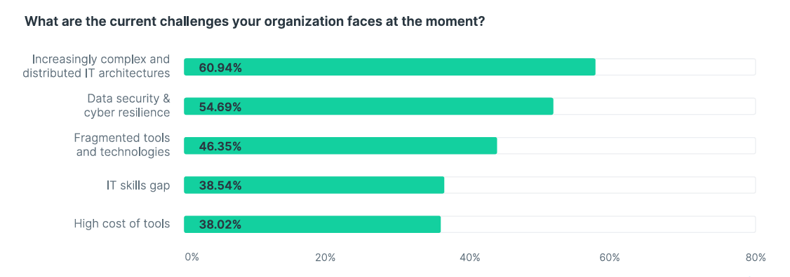 For most organizations, expanding the scalability and flexibility of IT infrastructure remains a top priority. However, this unrelenting dynamism comes at a cost: 80% of the IT professionals surveyed are grappling with increasingly complex tasks, and 83% feel heightened pressure to keep up with the rapid pace of innovation. Furthermore, nearly two-thirds of respondents express concern over the growing complexity of modern IT environments, as it makes management more difficult, expands the attack surface for cyber threats, and jeopardizes efficient IT operations.