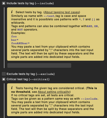 - Robot Framework parameters: In diesem Feld legen Sie die gängigsten Befehlszeilen-Parameter für Robot Framework fest. Der vielleicht wichtigste Parameter ist "Variables''. Er ermöglicht es Ihnen, Variablen zu konfigurieren, die dann Teil des globalen beziehungsweise Suite-Bereichs beim Ausführen der Suite sind. Erinnern Sie sich an die Variable "SEARCH_TERM" in der